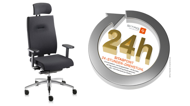 De 24-uurs versie van de SITAGPOINT reeks voldoet volledig aan al deze eisen. De synchrone hoogteverstelling voor de rugleuning en zithelling staan altijd garant voor een optimale verhouding tussen de zitting en rugleuning – die dynamisch zitten mogelijk maakt. Het past zich automatisch aan de zithouding van de gebruiker aan en is uitgerust met een verschuifbare zitting. Deze synchrone aanpassing kan worden vergrendeld in 3 posities – en kan zich aanpassen aan het lichaamsgewicht van de gebruiker.