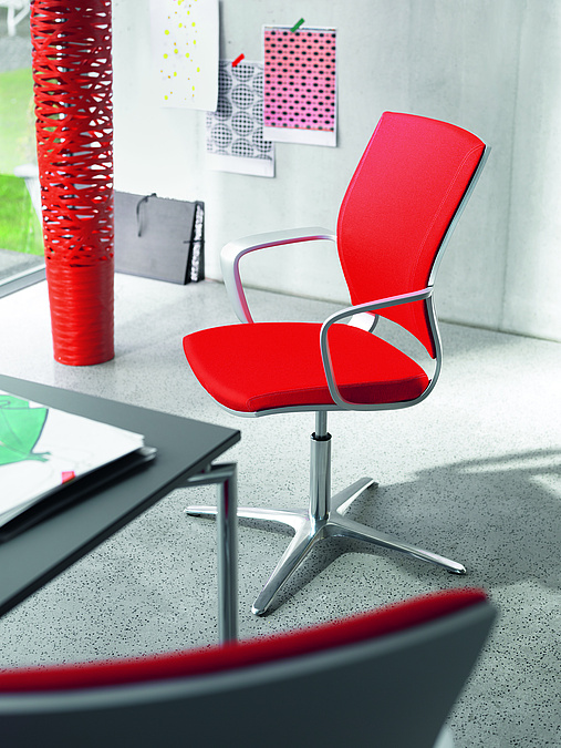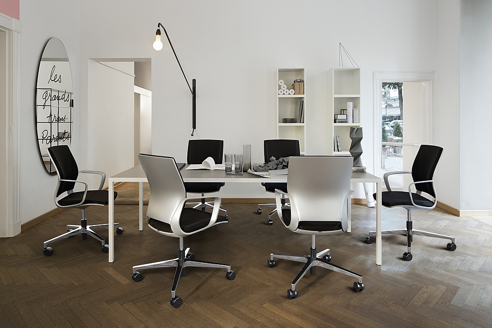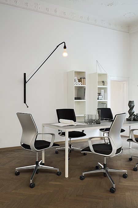 Buitengewone vorm en gezond comfort: Moteo vergader-draaifauteuils bieden een perfecte combinatie. Moteo zorgt voor mobiliteit en dynamiek tijdens het rondetafelgesprek. Na afloop wordt de oorspronkelijke tafelschikking weer snel hersteld met behulp van het terughaalmechanisme.