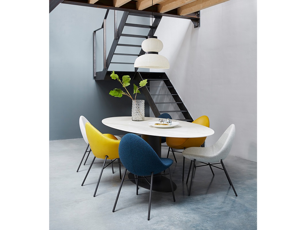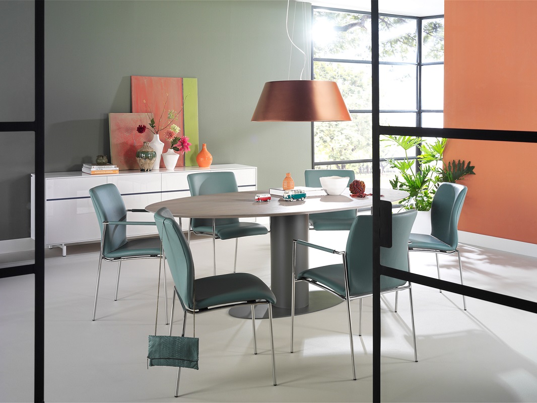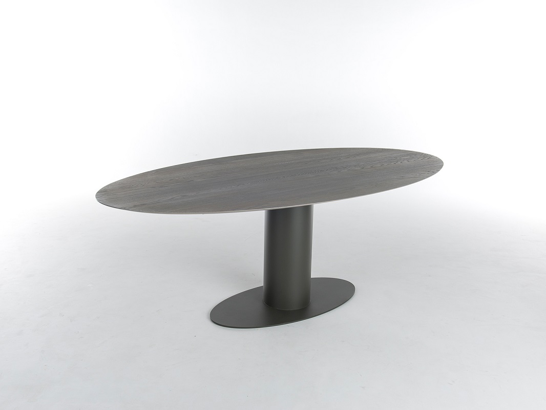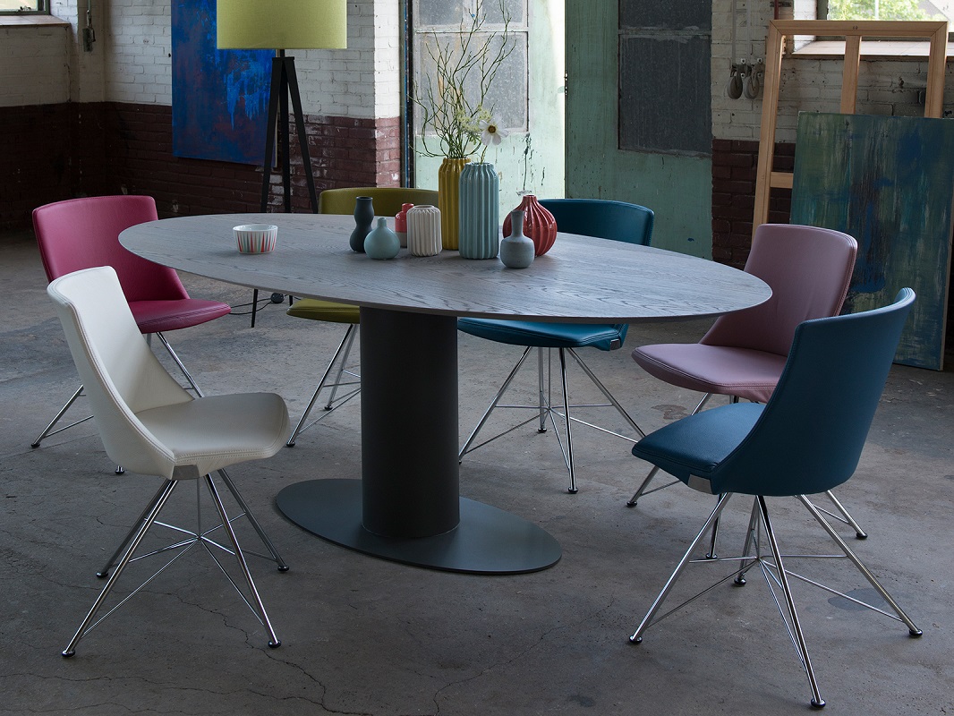 De chique ovale vorm van tafel Oval zorgt voor extra veel ruimte rondom de tafel en heeft een vriendelijke uitstraling. De Oval is leverbaar in vier ovale én vier ronde maten en wordt standaard uitgevoerd met een strakke kolom in antraciet.